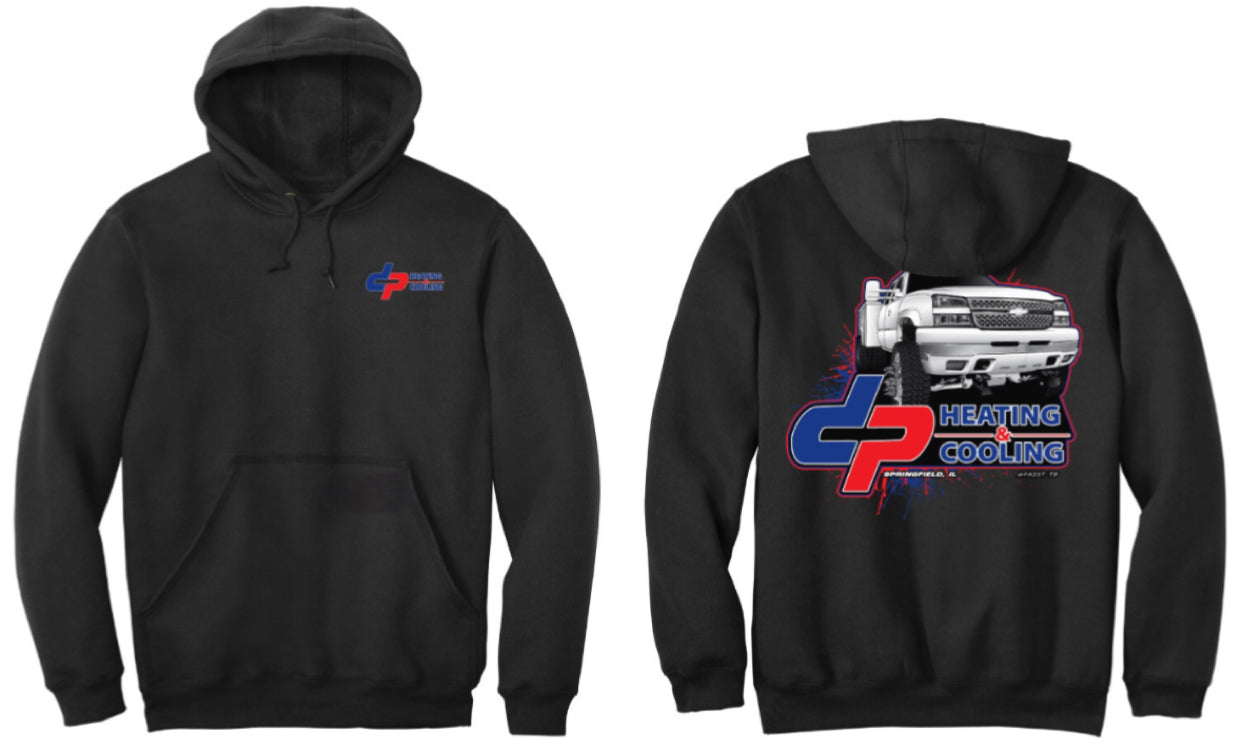 Black Port & Company essential fleece pullover hooded sweat shirt. DP Heating & Cooling logo on front left chest, and 2 Duramax LBZ Service Trucks on back